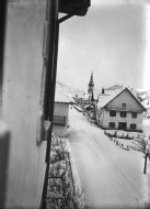 Plano picado de la calle Antonio Aróstegui de Garralda nevada, tomada desde el este en las escuelas, también llamadas casa Aróstegui. En la derecha, casa Cornelio y, en un segundo plano, la iglesia de San Juan Evangelista.