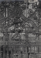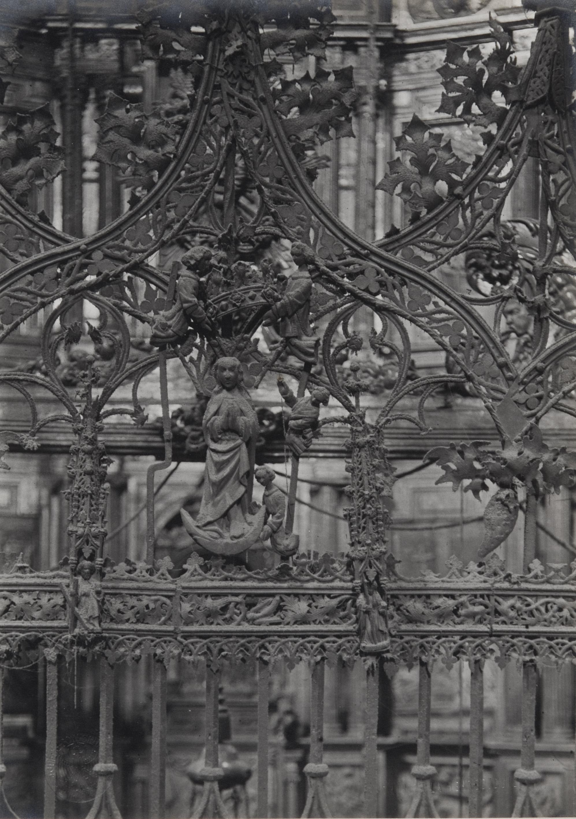 En el anverso, ángulo inferior izquierdo, sello seco del "ESTUDI DE FOTOGRAFIA MAS. BARCELONA". Fotografía instalada sobre soporte secundario encuadernado (tomo 17). En el reverso, ficha impresa del "Museo Iconográfico del Reino" promovido por la Diputación Foral, con anotaciones manuscritas de localización ["Catedral. Verja del altar mayor. Detalle. La coronación de la Virgen"]. La reja fue elaborada en 1517 por Guillermo Erbenat.