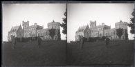 • Contenido: Vista del castillo de la Abadía en el municipio de Hendaya, Francia, tomada desde el oeste. En primer término, 2 hombres, uno de ellos de espalda con uniforme y un maletín. Al fondo el castillo - observatorio.