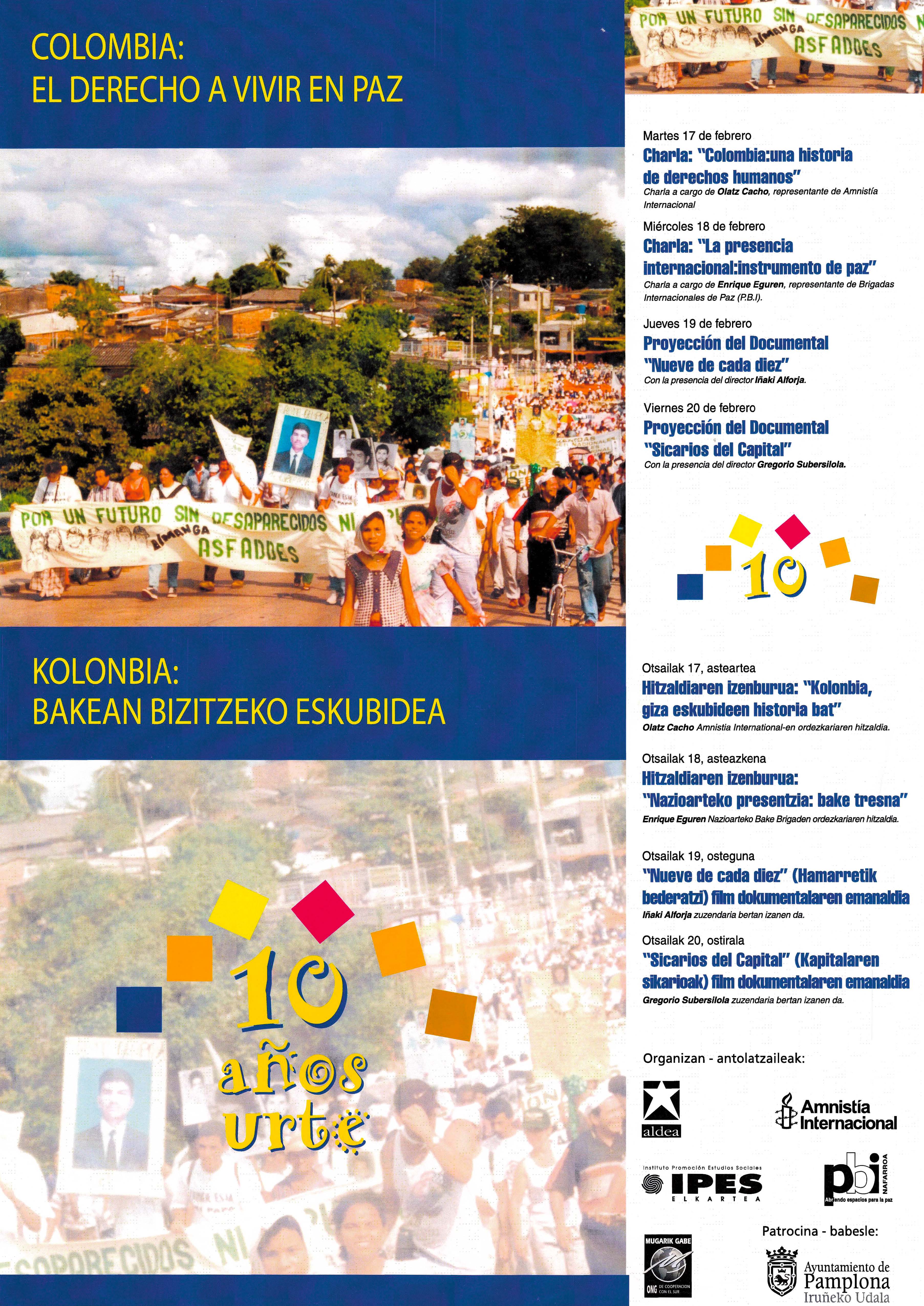 Cartel que anuncia la décima edición la de las jornadas Colombia: el derecho a vivir en paz, organizadas en 2009 por Mugarik Gabe Nafarroa, Aminstía Inetrnacional, PBI, Aldea, Ipes, y la colaboración del Ayuntamiento de Pamplona. El cartel muestra dos fotografías de manifestacioones por la paz en Colombia y el programa de actividades; 17 de febrero: "Colombia: una historia de Derechos Humanos", con Olatz Cacho (Amnistía Internacional); "La presencia internacional: Instrumento de paz", con Enrique Eguren (PBI); 19 de febrero, proyección del documental "Nueve de cada diez", con Iñaki Alforja, director; 20 de febrero, proyección de documental "Sicarios del capital", con el director Gregorio Subersiola.