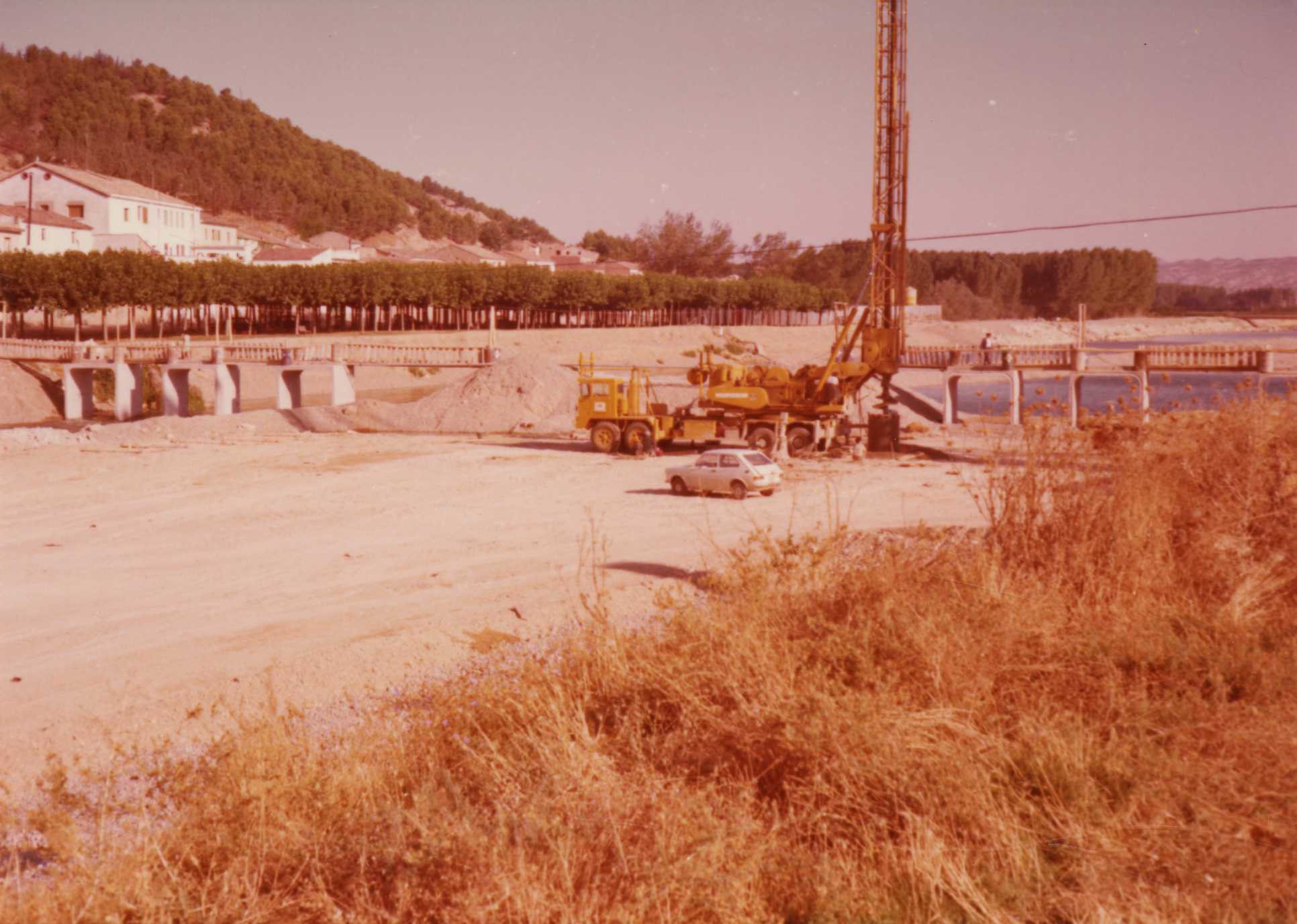 Vista general de los trabajos de cimentación de pilares del nuevo puente sobre el río Arga en Funes, tomada desde la margen izquierda, al sureste. En el centro, una máquina perforadora trabaja sobre una plataforma de tierra levantada en el lecho fluvial junto a un automóvil. Más atrás, pasarela acondicionada en el cauce fluvial sobre módulos de hormigón para el tránsito de peatones. Al fondo, arboleda y casas del centro urbano de Funes sobre la margen izquierda.