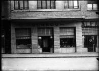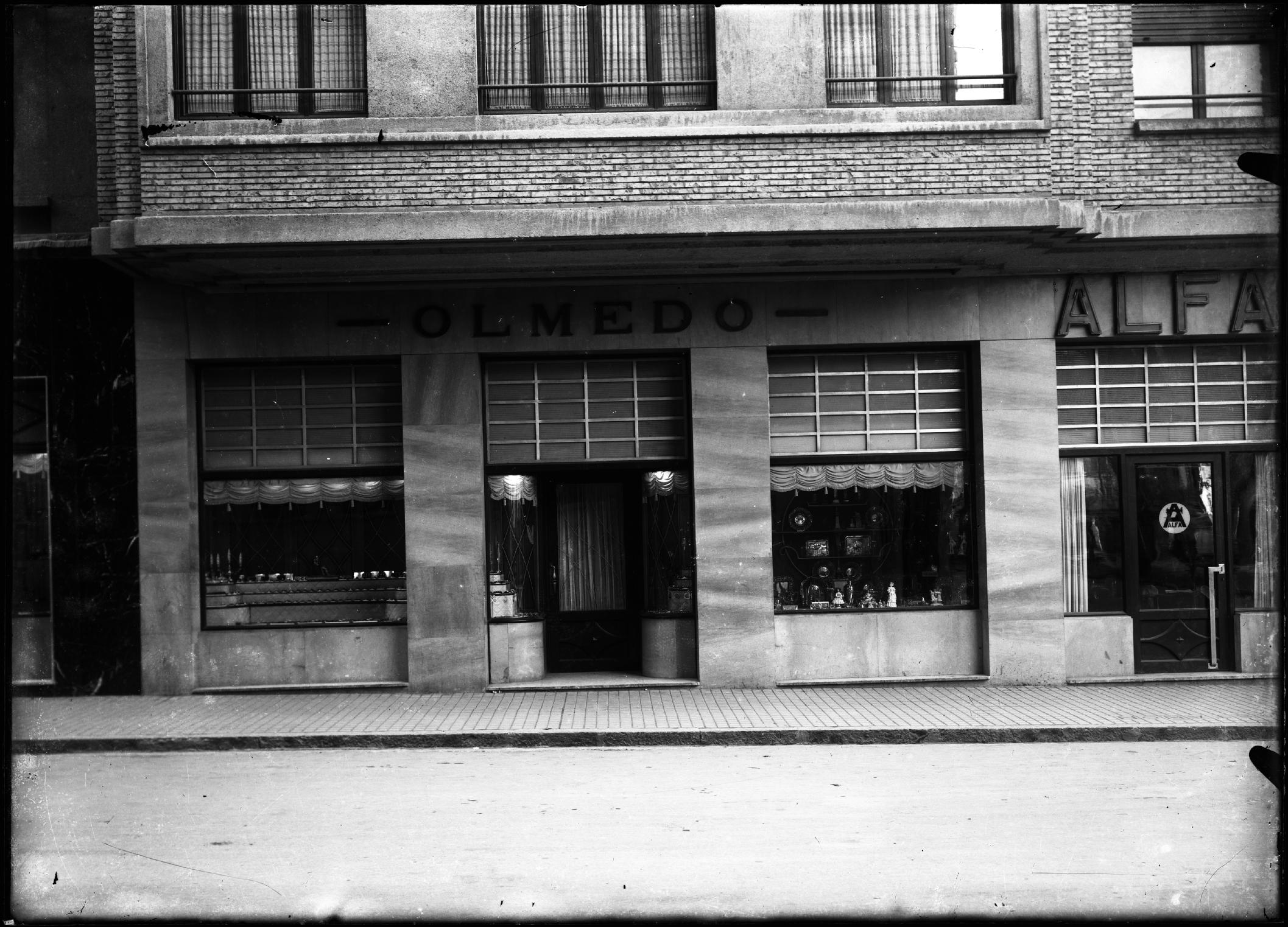Vista de frontal de la fachada del local comercial de joyería Olmedo en la calle García Castañón, número 2, de Pamplona. En la parte superior, el rótulo: "OLMEDO" y, en la izquierda, "ALFA".