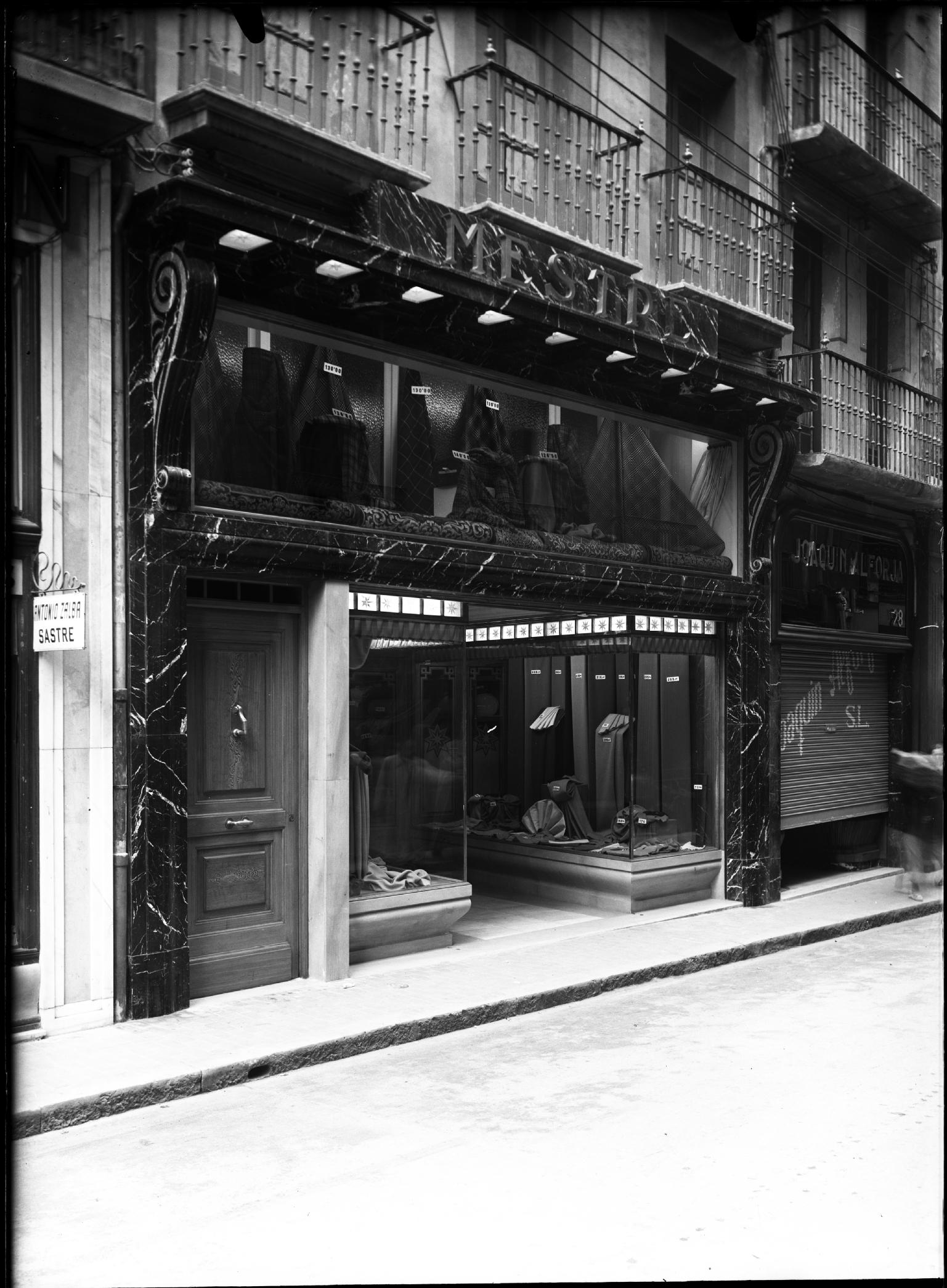 Vista de la fachada del local comercial de venta de tejidos Mestre en la calle Zapatería, número 30, de Pamplona. En la parte superior, el rótulo: "MESTRE". En la izquierda, cartel de Antonio Zalba, Sastre y, en la derecha el comercio de Joaquín Alforja.