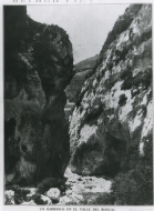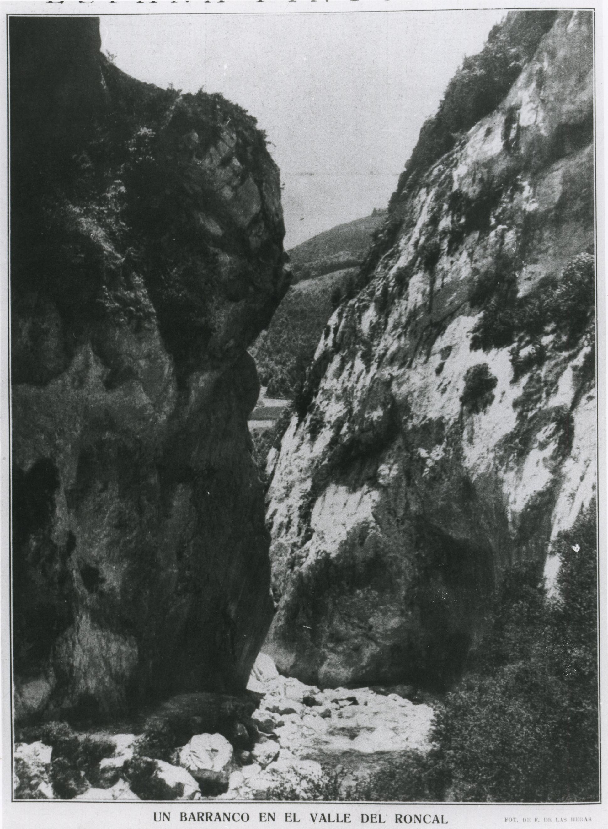 Reproducción fotográfica de un fotograbado publicado en la revista ilustrada "La Esfera" con vista interior de la foz de Minchate o Atea de Mintxate en Isaba, en el valle de Roncal, tomada desde el noreste. Bajo la imagen, pie de imagen identificativo y autoría impresos: "UN BARRANCO EN EL VALLE DE RONCAL. FOT[OGRAFÍA] DE F[RANCISCO] DE LAS HERAS".