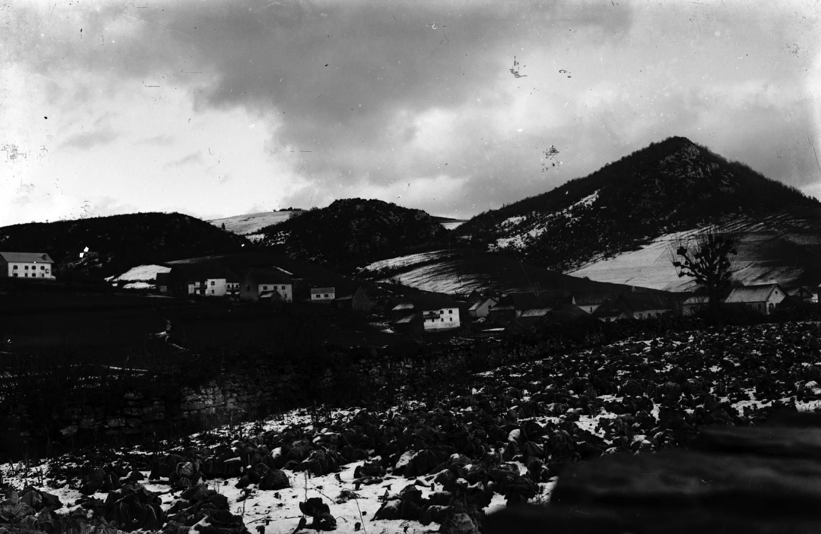 Vista de la localidad de Garralda con nieve tomada desde el suroeste. En primer término, la ladera de Ezpondeta, en segundo plano el núcleo de población y, al fondo, el monte Erondoa.
