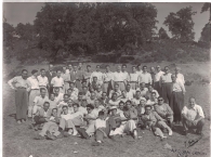 Retrato en plano entero de un numeroso grupo de hombres, miembros de la Asociación Musical de Los Amigos del Arte de Pamplona, en un prado, algunos de ellos con instrumentos, durante una excursión al lugar de Arquijas, Zúñiga.