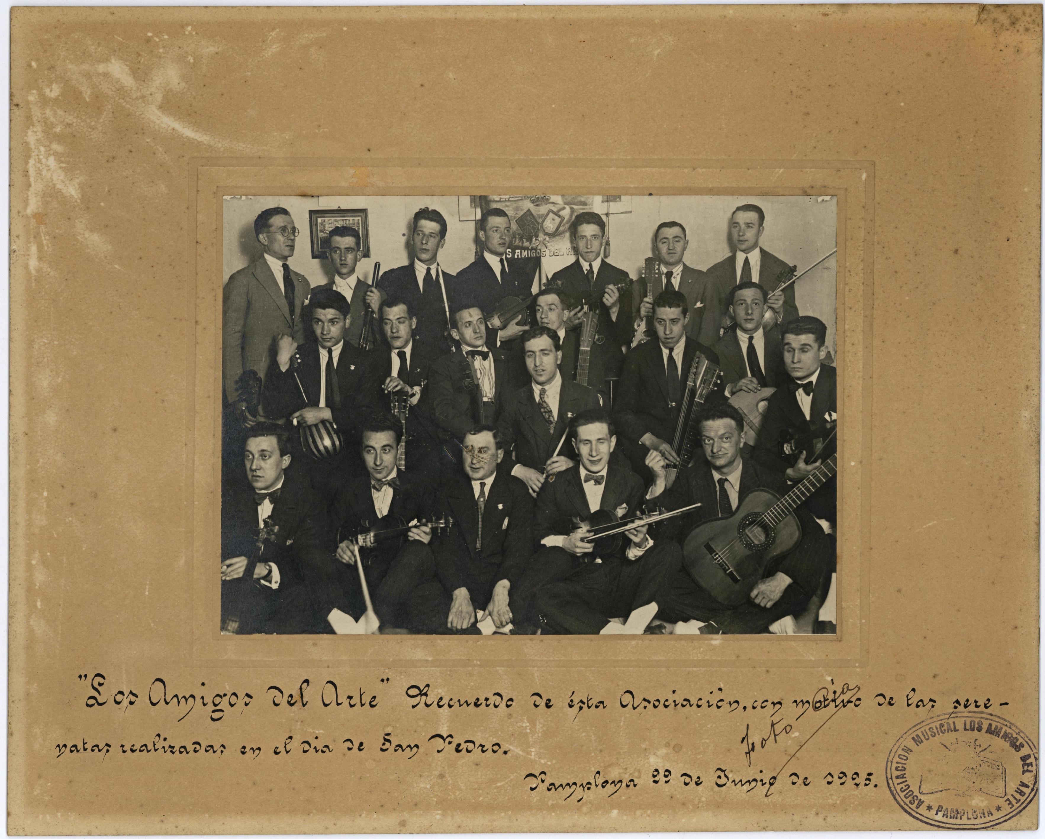 Sobre paspartú de 23,5x29,5 cm. Nota manuscrita: "Los Amigos del Arte" Recuerdo de ésta asociación con motivo de las serenatas realizadas en el día de San Pedro. Pamplona, 29 de Junio de 1925. Firma del fotógrafo: Foto Cía. Sello de tinta: ASOCIACIÓN MUSICAL LOS AMIGOS DEL ARTE. PAMPLONA.
