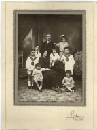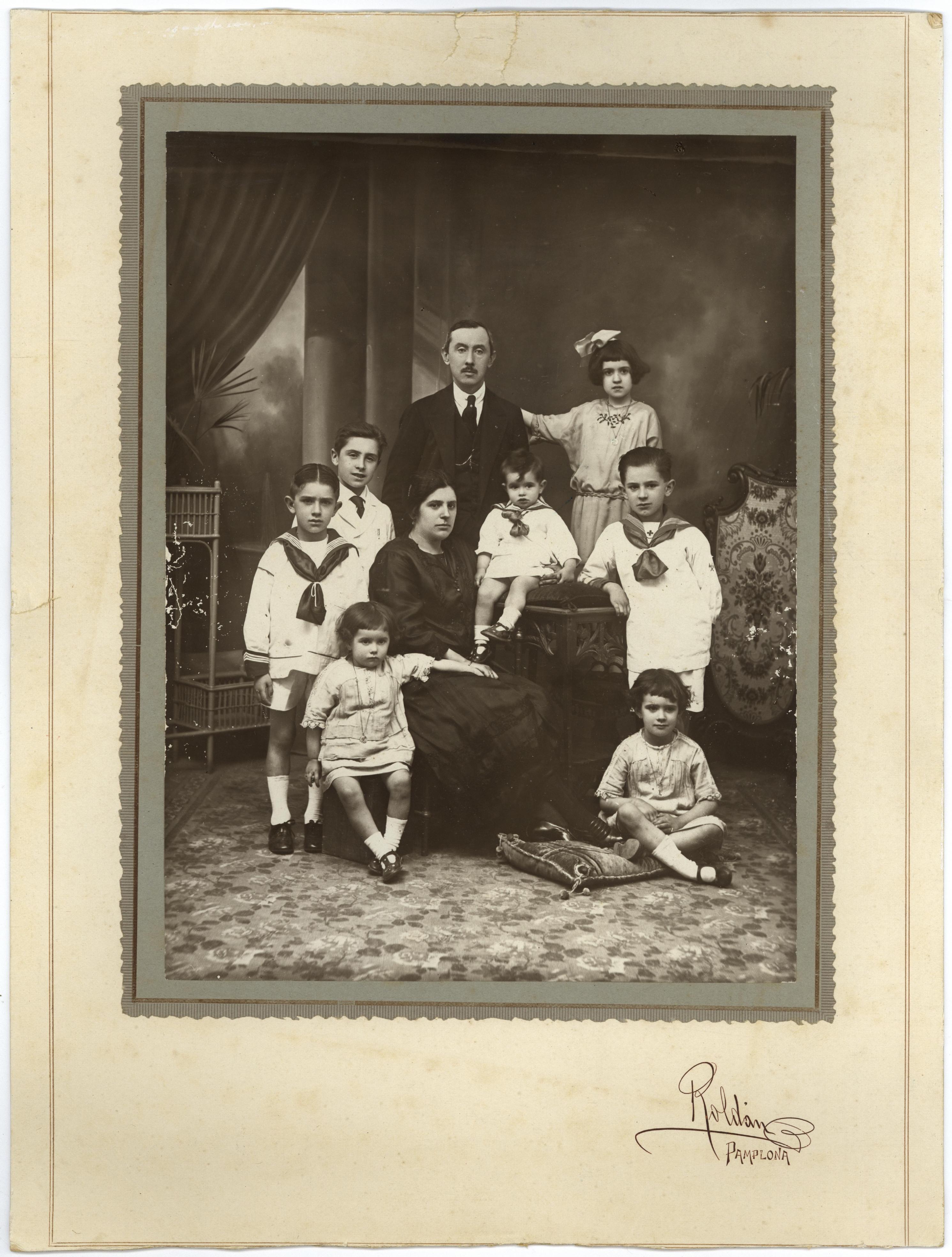 Retrato de estudio en plano entero de un grupo familiar compuesto por el matrimonio y 7 hijos, 4 chicos y 3 chicas. Sobre el soporte secundario, leyenda identificativa impresa:"Roldan / Pamplona".