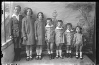 Retrato en plano entero de 7 hijos de José Martínez Berasáin y Ramona Erro Cía, en una galería con un fondo pintado con una fuente en una terraza y paisaje, al fondo. De izquierda a derecha, Luis, Margarita, Mercedes, José Ramón, Javier, Alejandro y Juan Bautista.
