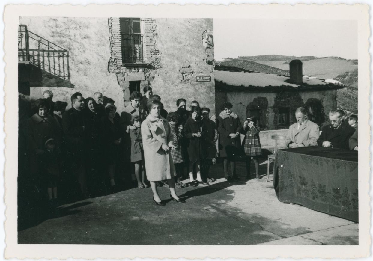 Vista del público en el homenaje del ayuntamiento de Navascués al maestro Jesús Lacasia Redín celebrado en la localidad de Aspuz. De pie, una mujer hablando a la presidencia del acto que se encuentra en la derecha. En segundo plano, el público en la calle delante de la fachada de una casa con el cartel de "TELEFONOS".