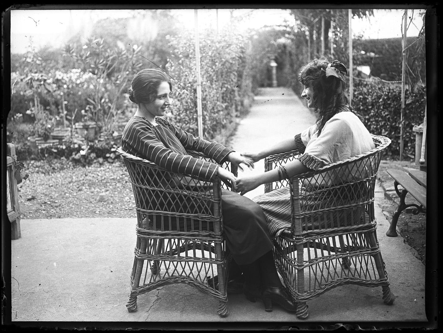 Retrato en plano entero de Jenara Altadill Aldave y una mujer joven sentadas y cogidas de las manos en el jardín de "Garden House", la casa de recreo familiar situada en el paraje de La Magdalena en Pamplona.