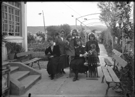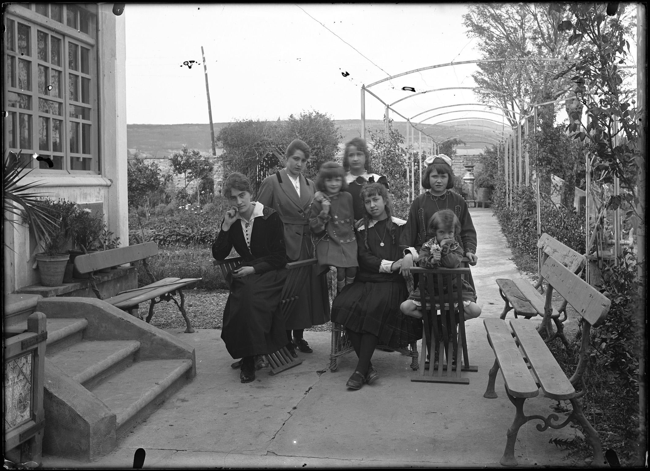 Retrato en plano entero de un grupo de 7 mujeres en el jardín de "Garden House", la casa de recreo de la familia Altadill Aldave situada en el paraje de La Magdalena en Pamplona. Sentada, en el centro, María Josefa Altadill Aldave, detrás, en pie, Jenara y sentada con una flor en la derecha, María del Carmen.