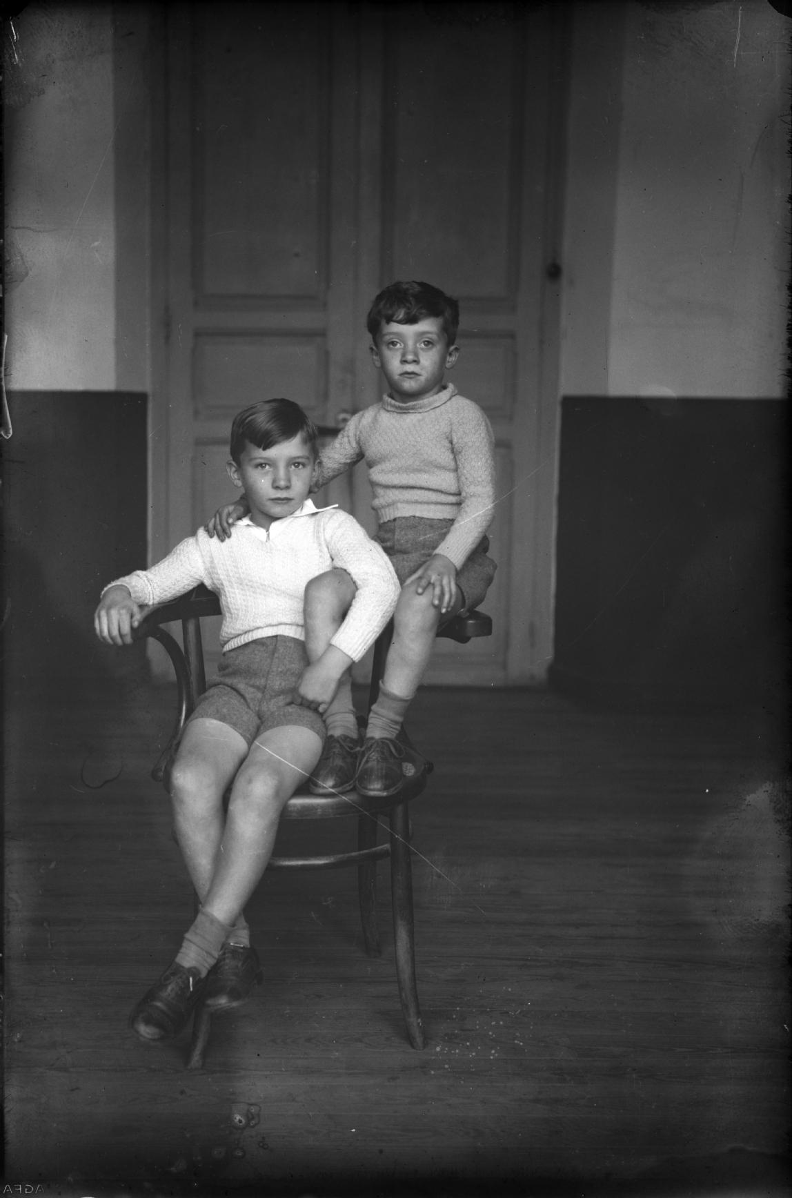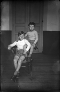 Retrato de cuerpo entero de los hermanos Jesús María y José Luis Velasco Iriarte, hijos de José y María. En primer término, Jesús María sentado en una silla, a su izquierda, su hermano José Luis sentado en el brazo de la misma silla, al fondo una puerta.