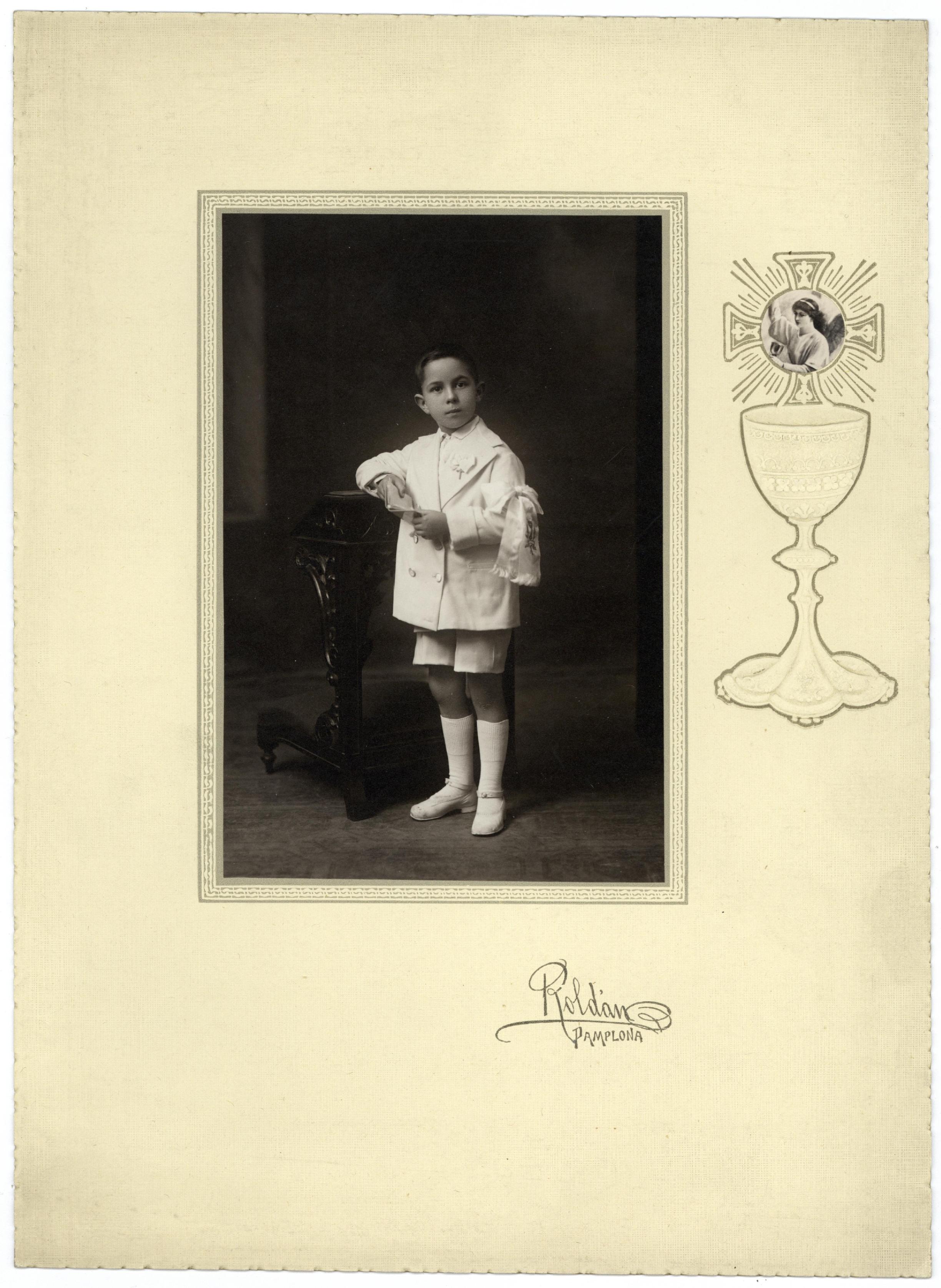 Retrato en plano entero de José Ignacio Iraizoz Astiz con traje de Primera Comunión, rosario y misal. Sobre el soporte secundario, leyenda identificativa impresa:"Roldan / Pamplona" y grabado en seco de un cáliz.