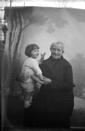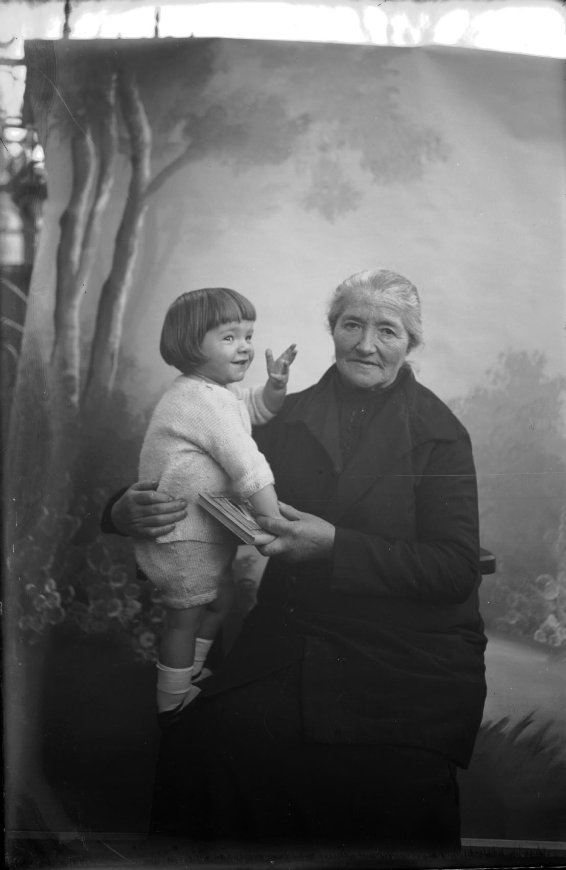 Retrato de estudio en plano entero de Tomasa y su nieto José Luis Velasco Iriarte. En primer término Tomasa, abuela materna, sentada en una silla con José Luis de pie sobre la silla, con fondo de paisaje.