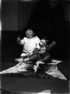 Retrato en plano entero de José Luis Velasco Iriarte, hijo de José y María, sentado sobre una piel y con un perro de peluche. Detrás María Hernández, abuela paterna, sujeta al niño.