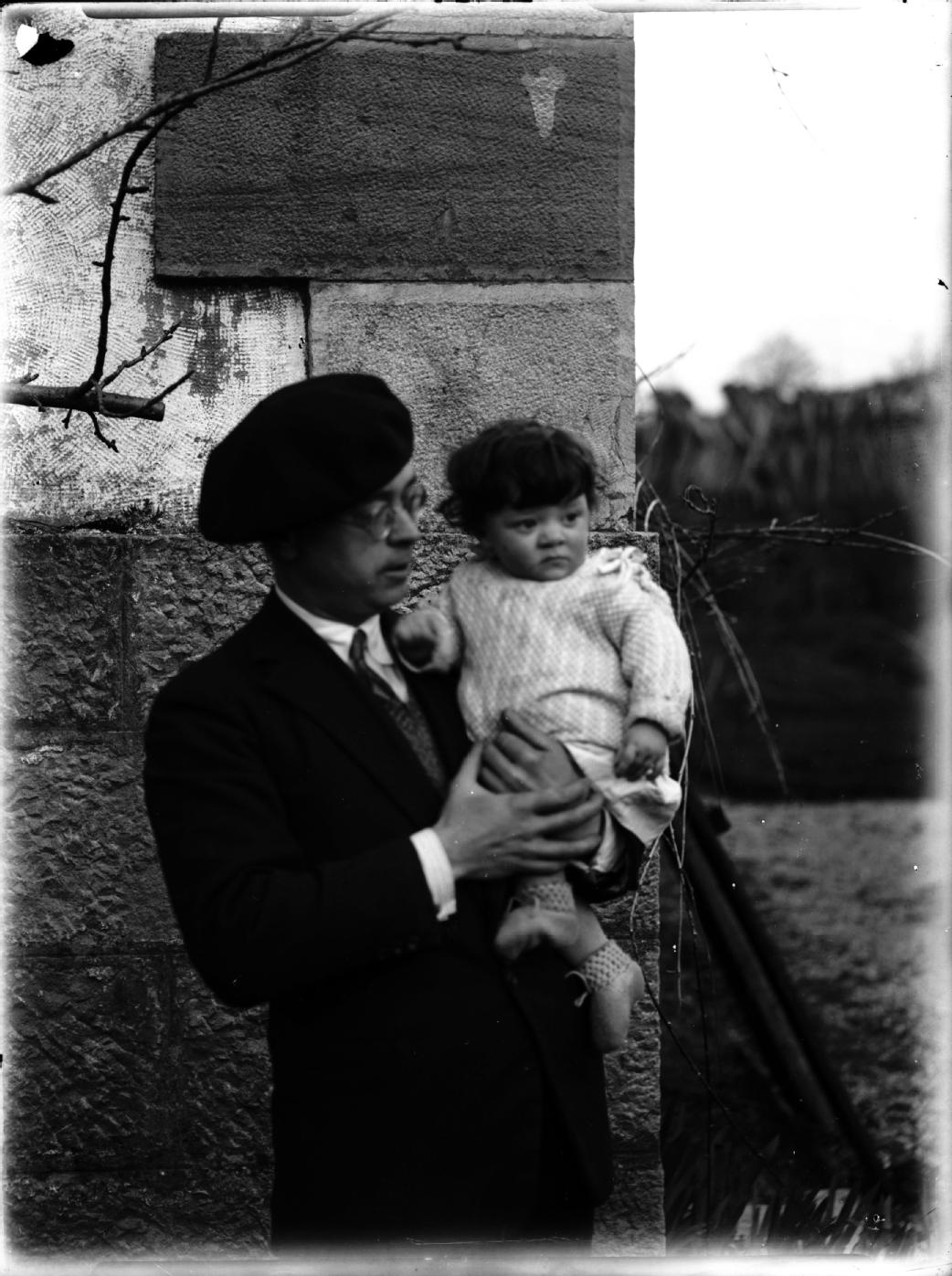 • Contenido: Retrato en plano medio de José Velasco Hernández con su hijo menor, José Luis, en brazos en Garralda.