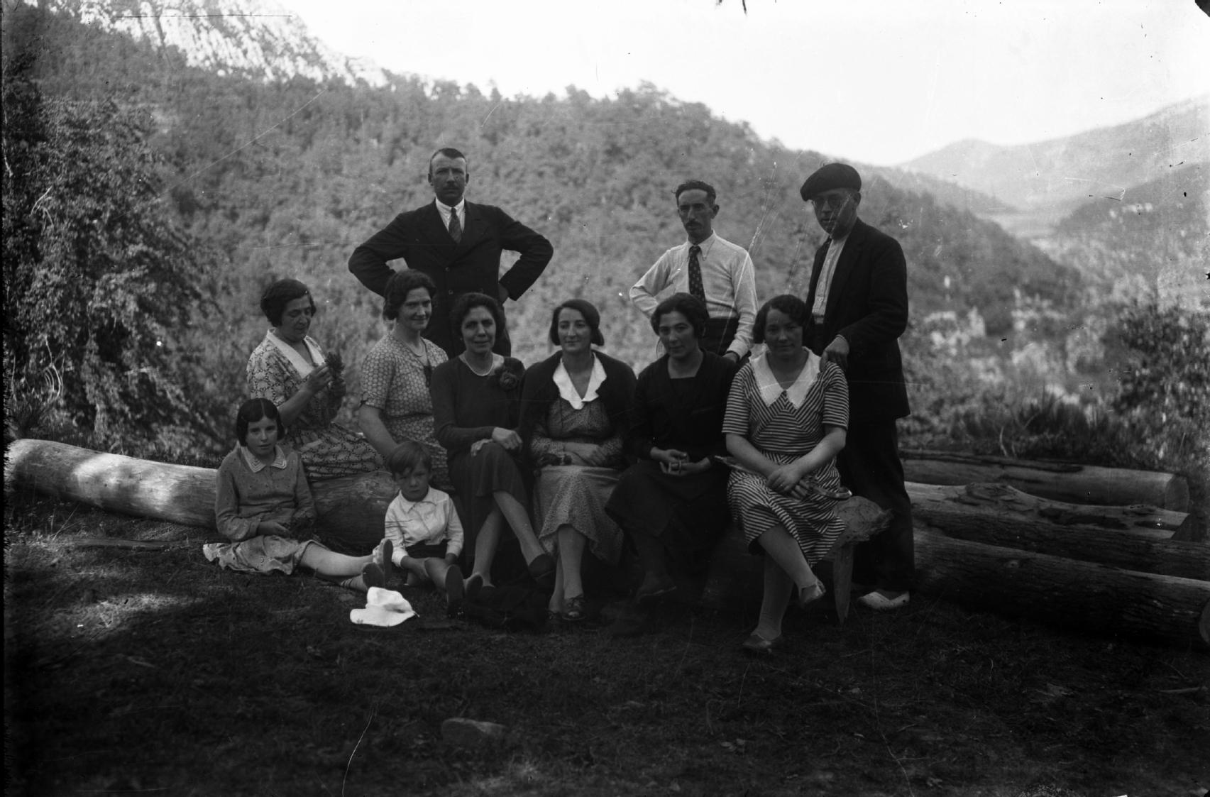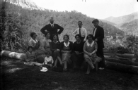 Retrato en cuerpo entero de José Velasco Hernández con un grupo de amigos y familiares en el campo. En primera línea, sentado en el suelo, Jesús María Velasco Iriarte, a su derecha, una niña. En segunda fila, de izquierda a derecha, una mujer, Concepción Iriarte, 2 mujeres, Teresa Velasco y Micaela Iriarte, detrás, de pie, 2 hombres y José Velasco. Al fondo, los montes del entrono de Garralda.
