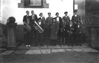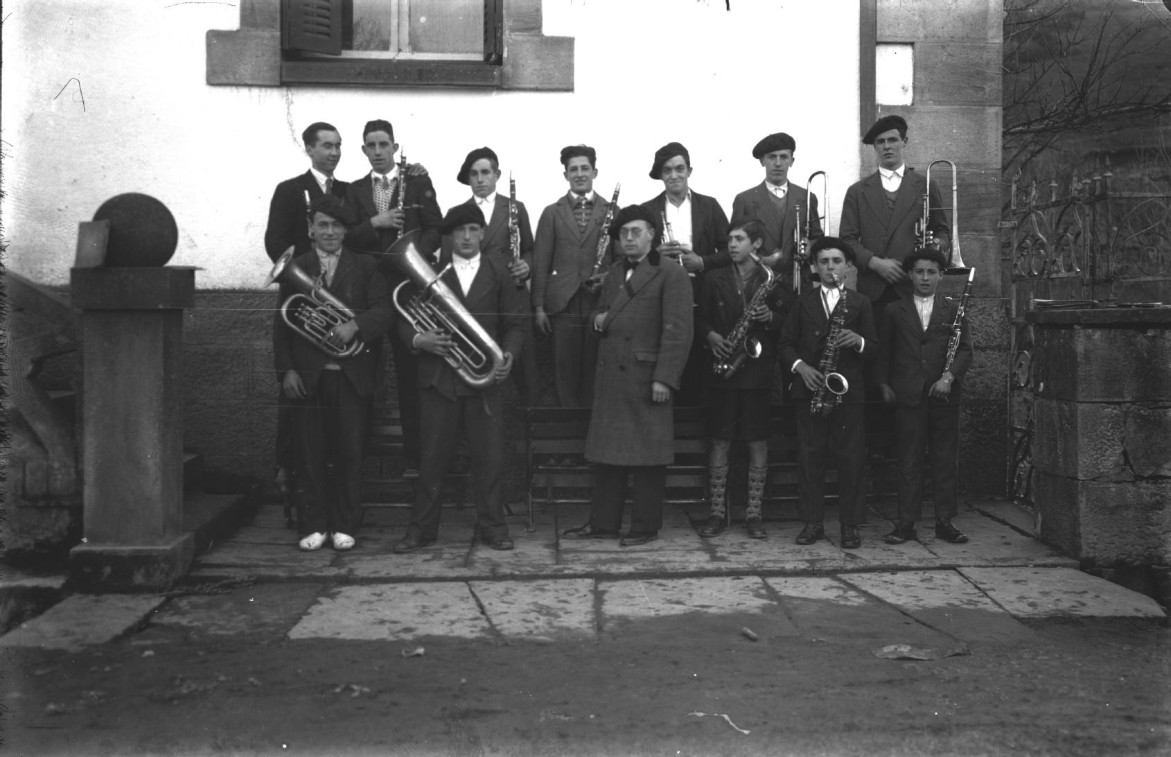 Retrato en plano entero de la banda de música de la localidad de Garralda con José Velas Hernández, junto a las escaleras de la escuela, localizada en la calle Antonio Arostegui, 3. En la primera fila, de izquierda a derecha, Pascual (Enecho), Sotero (Iroch), José Velasco, Modesto Orbaiz, Justo Iriarte y José Rota; en la segunda fila, Félix Orbaiz, Alfonso Laurenz, Matías Iriarte, José de Iroch, Domingo Larraz, Demetrio (Pambolín) y Marcelino Goicoa.