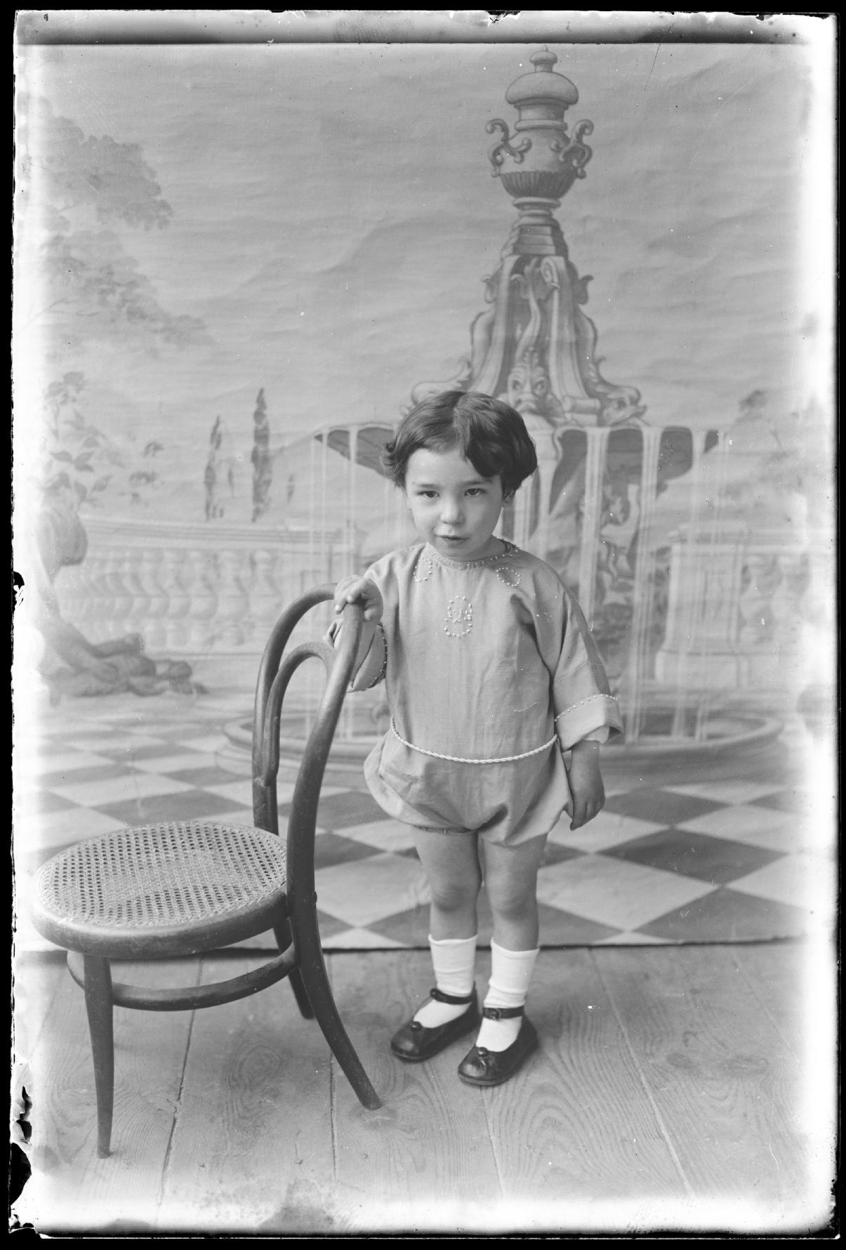 Retrato en plano entero de Juan Bautista Martínez Erro, hijo de José Martínez Berasáin y Ramona Erro Cía, de pie junto a una silla y con un fondo pintado con una fuente en una terraza y montes, al fondo.