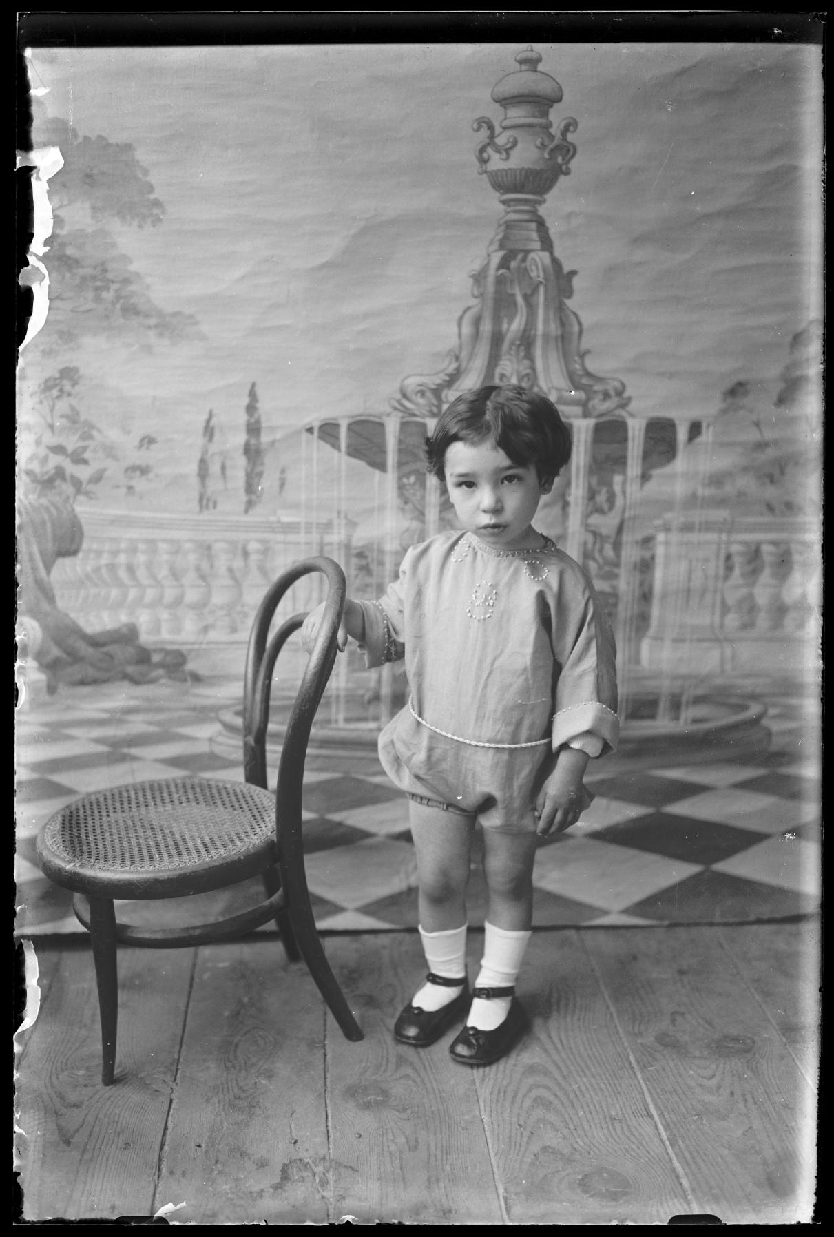 Retrato en plano entero de Juan Bautista Martínez Erro, hijo de José Martínez Berasáin y Ramona Erro Cía, de pie junto a una silla y con un fondo pintado con una fuente en una terraza y montes, al fondo.