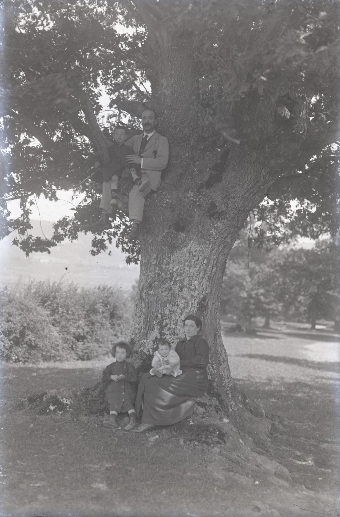 Retrato de la familia Martínez Erro en un árbol. En la base del árbol sentadas Ramona Erro y sus hijas Margarita y Mercedes; subidos en una rama, José Martínez Berasáin con su hijo Luis.