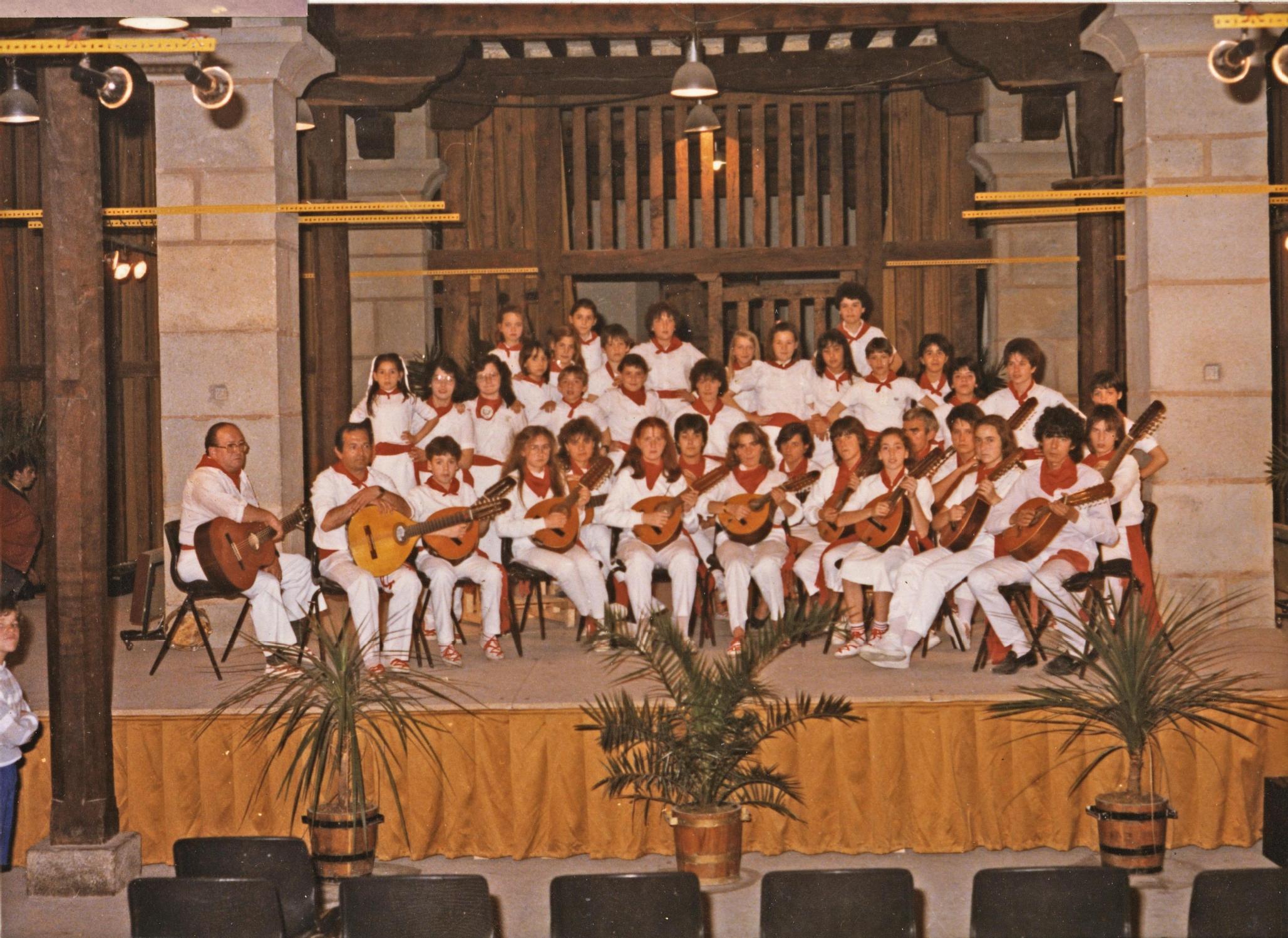 Retrato en plano entero del grupo de compone la rondalla y el grupo de jotas de Los Amigos del Arte sobre un escenario en la sala de Armas de la Ciudadela de Pamplona.