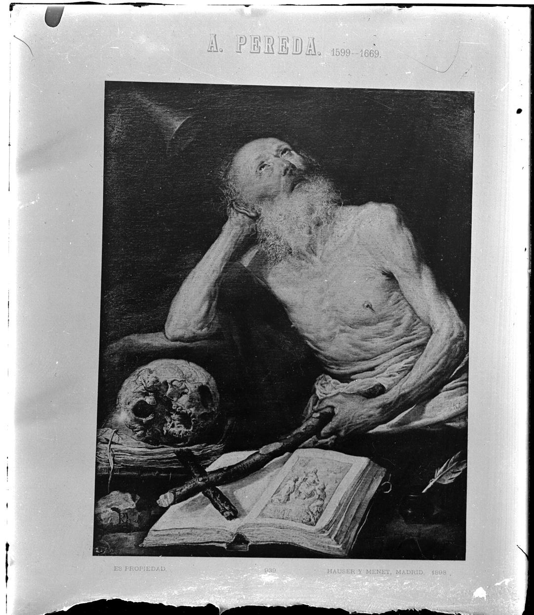 Reproducción de una lámina fototípica de Hauser y Menet con representación de la pintura "San Jerónimo", obra de Antonio de Pereda y Salgado conservada en el Museo Nacional del Prado, en Madrid. Sobre la imagen, leyenda impresa: "A. PEREDA. 1599-1669". Bajo la imagen, leyenda impresa: "ES PROPIEDAD. 939. HAUSER Y MENET, MADRID. 1898".