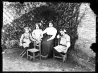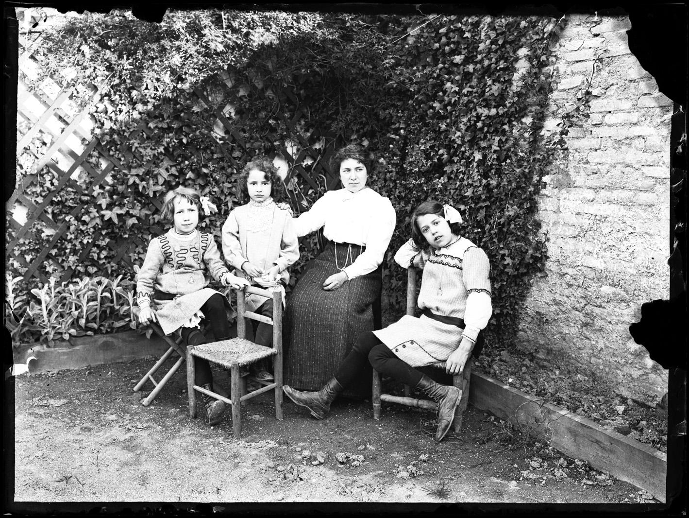 Retrato en plano entero de María Josefa, Jenara, una institutriz y María Altadill Aldave en el jardín de "Garden House", la casa de recreo familiar situada en el paraje de La Magdalena en Pamplona.