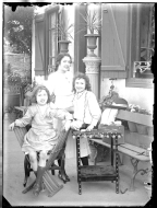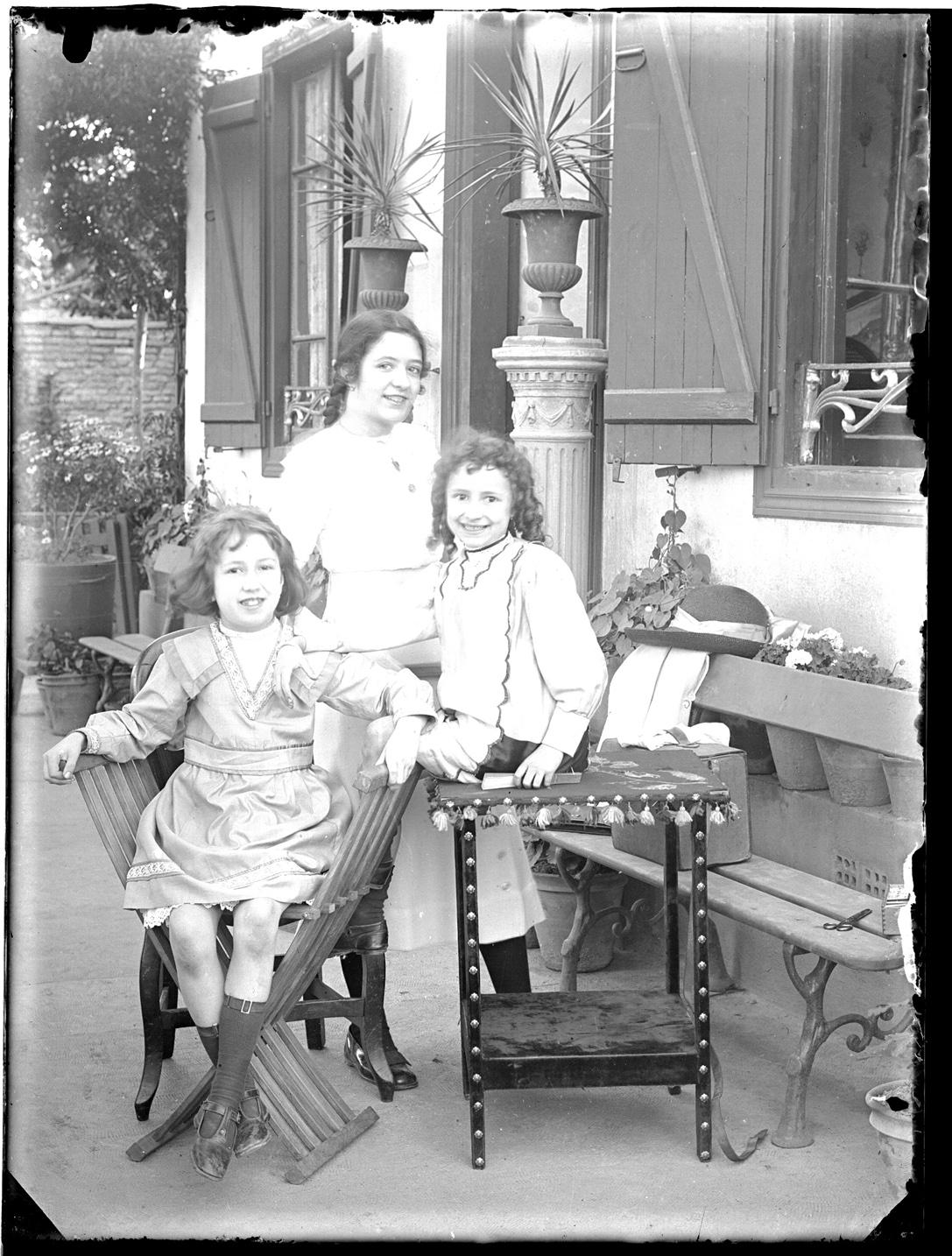 Retrato de 2 niñas, las hermanas María Josefa y Jenara Altadill Aldave, acompañadas por una muchacha en la terraza de "Garden House", la casa de recreo familiar situada en el paraje de La Magdalena en Pamplona.