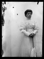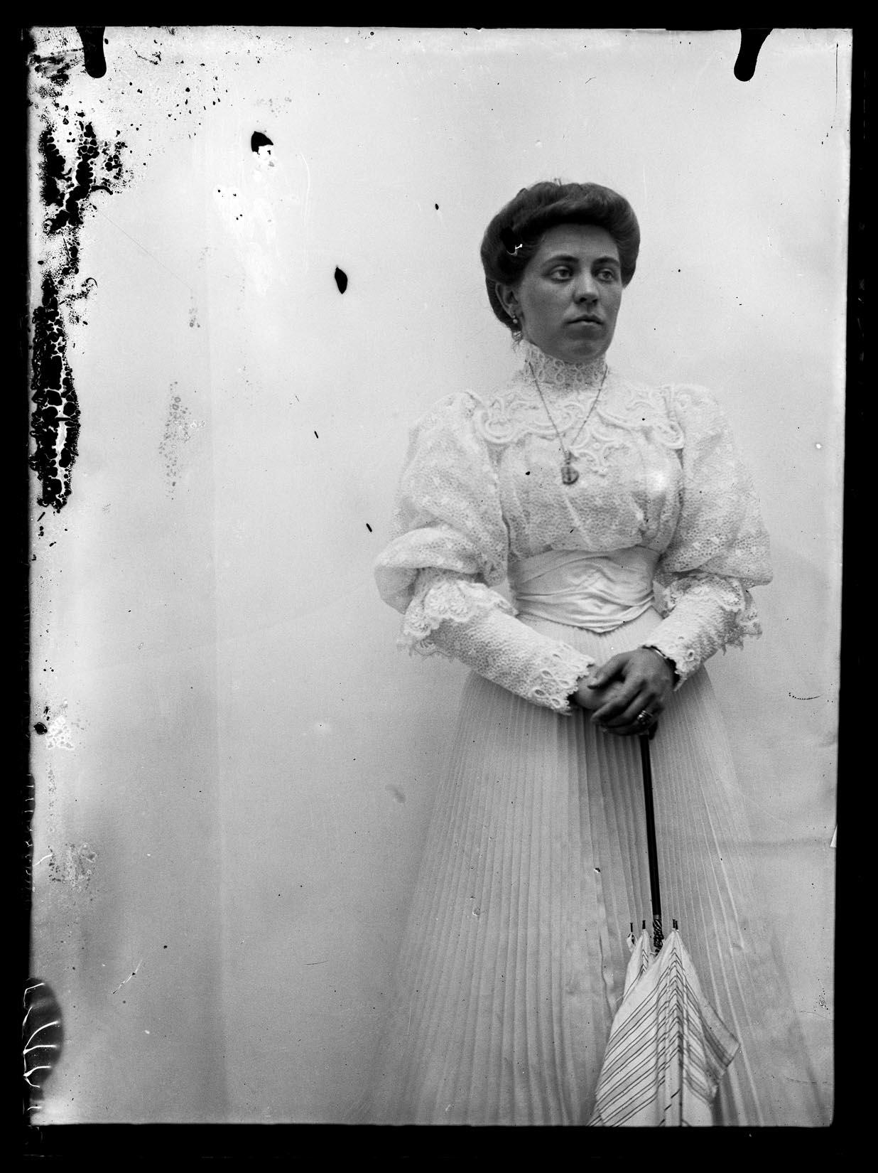 • Contenido: Retrato en plano americano de María Vicenta Astiz Iriarte vestida con traje claro y una sombrilla.