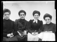 Retrato en plano americano de 4 mujeres sentadas. De izquierda a derecha, María Vicenta Astiz Iriarte, una hermana de su marido, Francisco Iraizoz Gastesi, con un libro, una mujer con un libro y otra hermana de su marido con un bastidor de bordar.