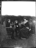 Retrato en plano entero de María y Jenara Altadill Aldave y una institutriz sentadas en unas sillas en el jardín de "Garden House", la casa de recreo de la familia Altadill Aldave situada en el paraje de La Magdalena en Pamplona.