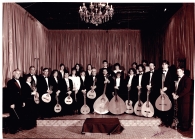Miembros de la rondalla de la Asociación Musical de Los Amigos del Arte en el escenario de su sede.