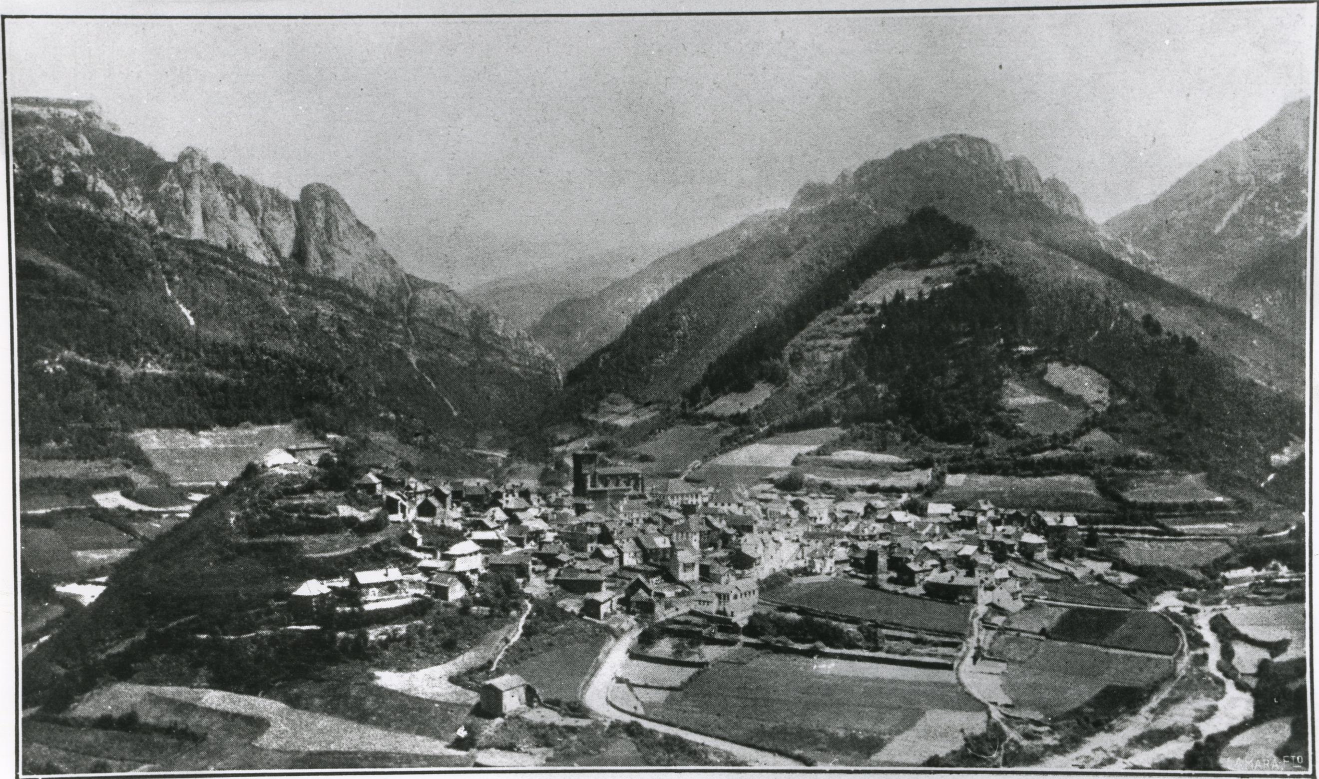 Reproducción fotográfica de un fotograbado publicado en la revista ilustrada "La Esfera" con vista panorámica del núcleo urbano de Isaba, en el valle de Roncal, tomada desde el suroeste. En primer término, el caserío del núcleo urbano rodeado por las cumbres del Pirineo. En el ángulo inferior derecho de la imagen reproducida, marca de autoría: "CAMARA F[O]T[ÓGRAF]O".