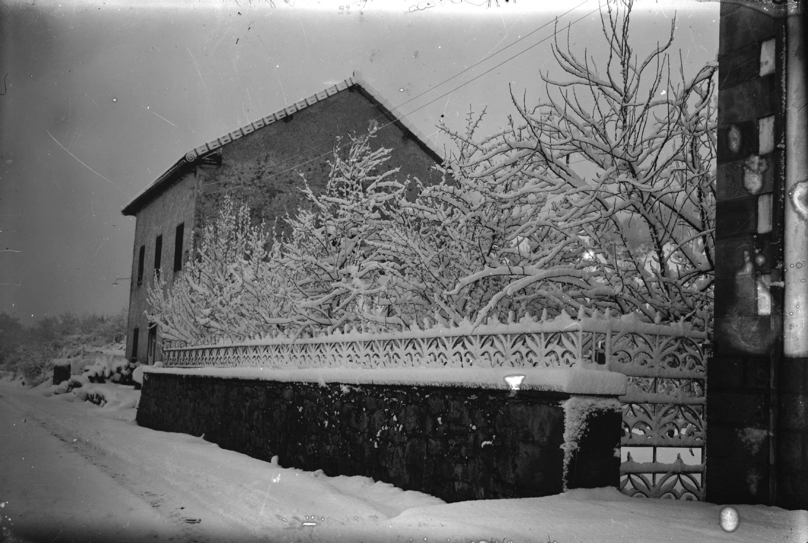 Vista nevada de la valla de la casa Aróstegui localizada en la calle Antonio Aróstegui número 3, tomada desde el oeste. En primer término la valla y la carretera nevada, en segundo plano la casa Damaso.