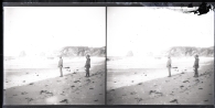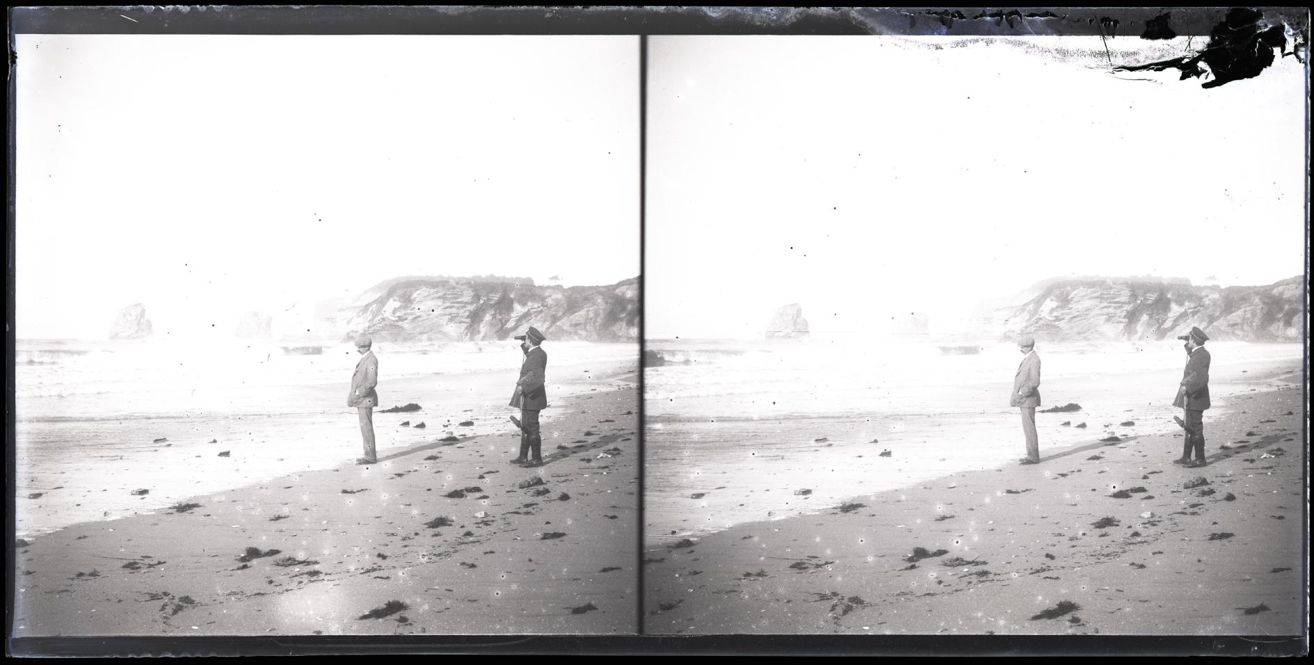 Vista de la playa de "Los dos gemelos" de Hendaya Francia con Pedro Ciga Mayo, junto a la orilla, y un hombre con uniforme y prismáticos en la arena.