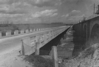 Vista general del puente de la carretera Marcilla - Villafranca (actual NA-660) sobre el río Aragón, en el término municipal de Marcilla, tomada desde la margen izquierda aguas arriba hacia el noreste. A la izquierda, calzada de la carretera a su paso por el puente protegida por pretiles de hormigón con barandados metálicos. A la derecha, el lecho fluvial y el nuevo puente de la línea de ferrocarril Castejón - Alsasua. Al fondo, la margen derecha.