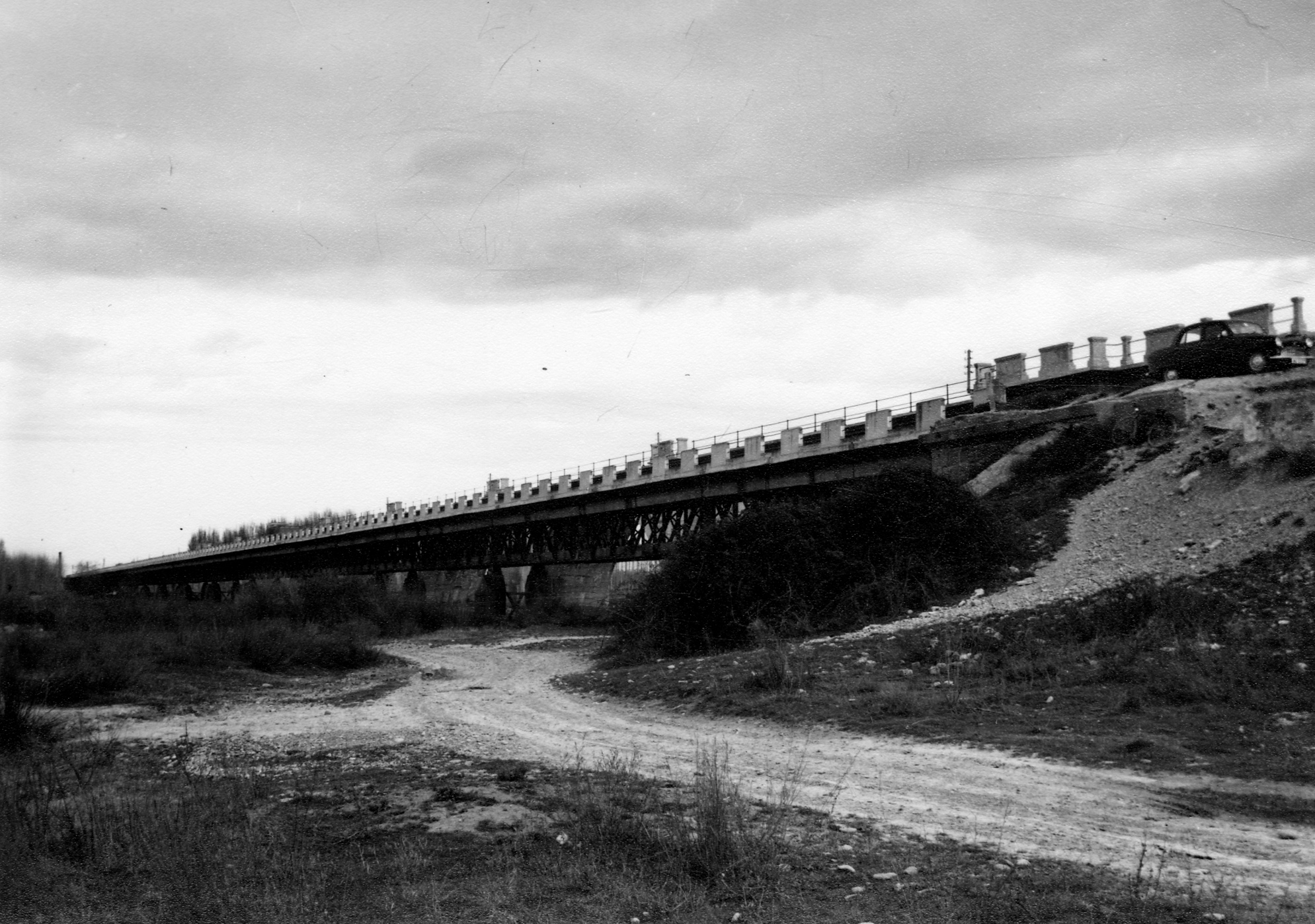 Vista general del puente sobre el río Aragón de la carretera Marcilla - Villafranca (actual NA-660), tomada aguas abajo, desde el lecho fluvial en las proximidades de la margen izquierda. En primer término, el cauce fluvial seco en las proximidades de la orilla izquierda. Sobre él, estructura del puente con pilares de hormigón, armadura metálica y tablero superior de hormigón armado con pretiles, con un automóvil sobre su extremo.