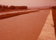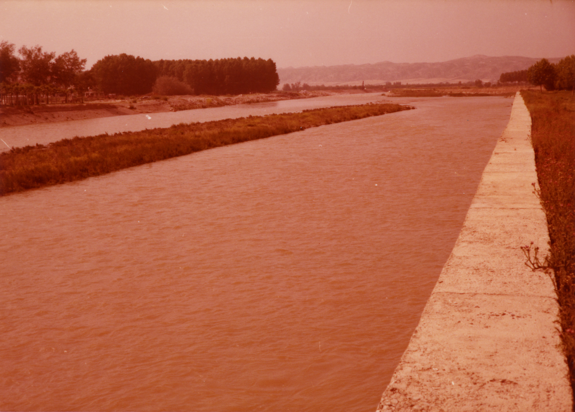 Vista general del curso del río Arga entre Peralta y Funes, tomada desde las inmediaciones del puente de Funes, sobre la margen izquierda, al sur. En primer término, el curso fluvial con un dique de tierra aguas arriba del puente. Al fondo, los Altos de Peralta.