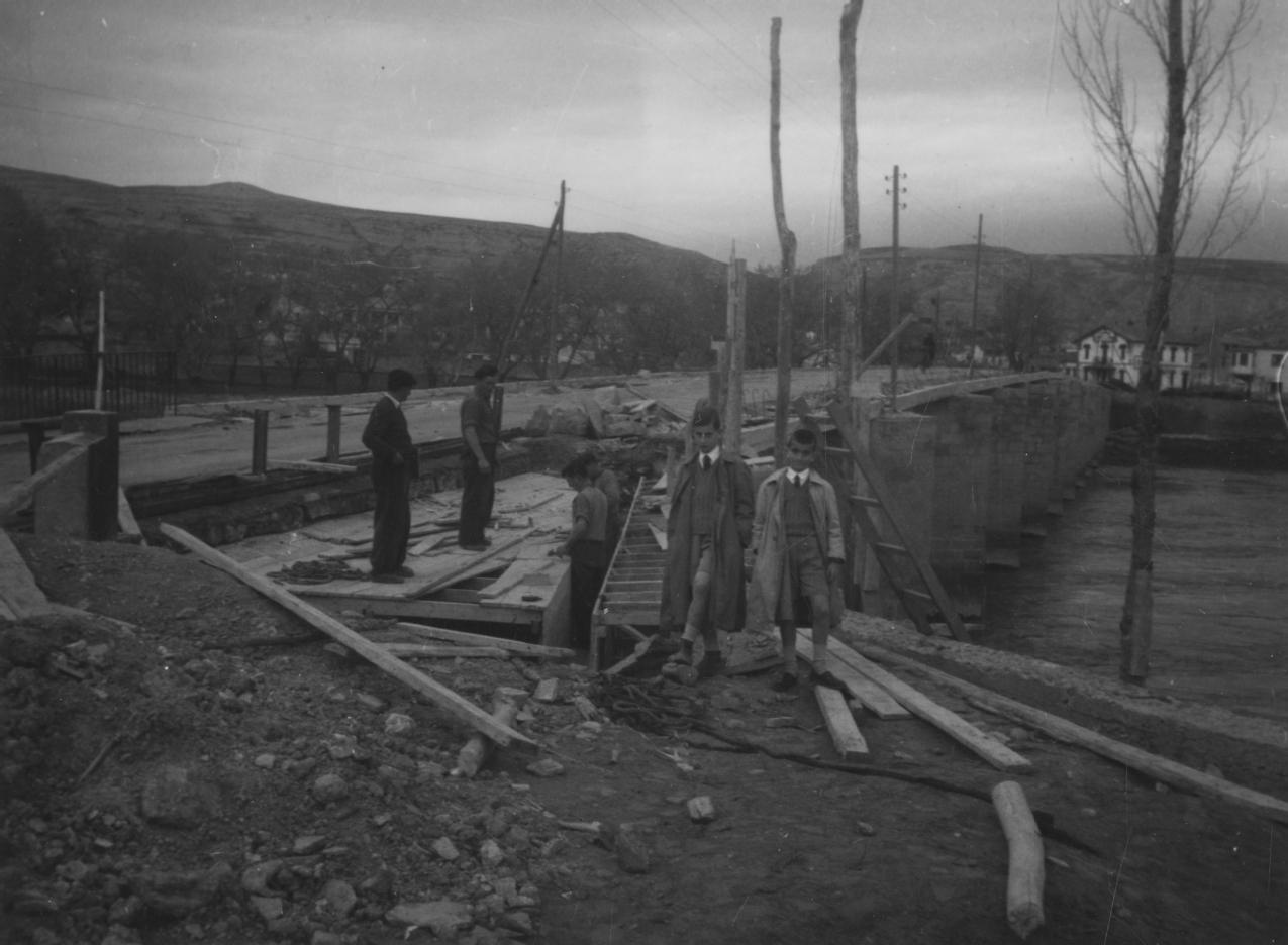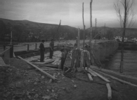 Vista general del puente sobre el río Ebro en Lodosa, tomada desde su extremo occidental durante los trabajos de ampliación de la calzada de la carretera Lodosa - Alcanadre (La Rioja) (actual NA-6540). En primer término, un grupo de 4 hombres trabaja en un encofrado en el extremo del puente, sobre la margen derecha; junto a ellos, 2 niños con uniforme y gabardina. Detrás, sobre el cauce fluvial, el puente con un encofrado para un nuevo tablero de hormigón superior. Al fondo, construcciones y montes de la margen opuesta.