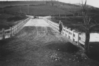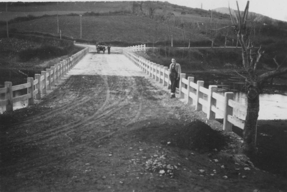 Vista general de la calzada del puente sobre el río Larraun en Allí, tomada desde el arranque del puente en la margen derecha. En el centro, calzada de la carretera Irurzun - Lecumberri a su paso sobre el puente (actual NA-7500), flanqueada por barandillas de hormigón; sobre ella, un hombre y, al fondo, un arriero con su carro.