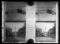 Reproducción de 2 imágenes estereoscópicas en positivo. La superior, el molino de Allí, municipio de Larraun en Navarra, nevado. La inferior, vista del paseo de Sarasate en Pamplona, tomada desde el oeste, con las estatuas de los reyes procedentes del Palacio Real de Madrid, el monumento a los Fueros y el Palacio de Navarra al fondo. Entra las dos imágenes, la nota: "Monumento a los Fueros, Pamplona".