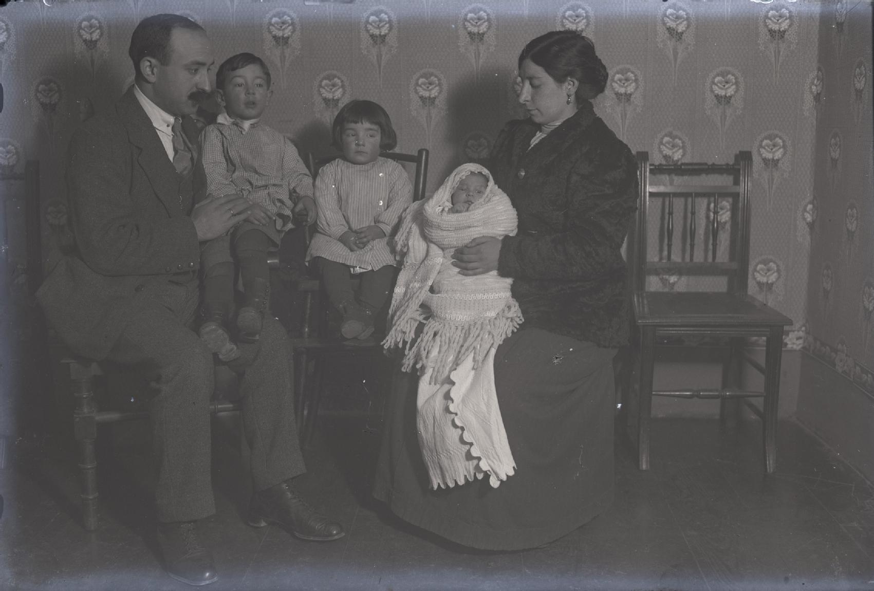 Retrato de grupo de la familia Martínez Erro. De izquierda a derecha, José Martínez Berasáin, sus hijos Luis, Margarita y Mercedes y su mujer, Ramona Erro, sentados en sillas en un interior.