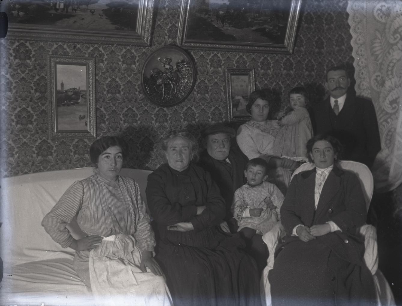 Retrato de la familia Erro en un interior. De izquierda a derecha sentados, una mujer, la abuela Emeteria, el señor Erro con Luis en sus rodillas y Ramona Erro. De pie, una mujer con Margarita en brazos y un hombre.