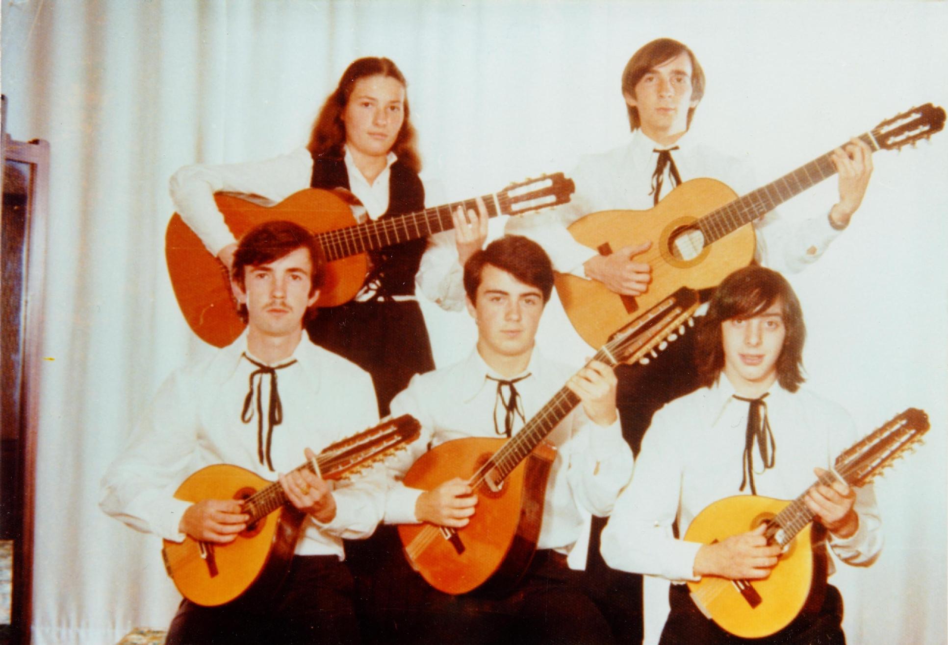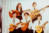 Retrato en plano americano de una rondalla de la asociación musical de Los Amigos del Arte de Pamplona compuesta por 4 hombres y una mujer. En primer término, 3 hombres jóvenes con bandurrias sentados. En segunda fila, una mujer y un hombre, jóvenes, con guitarras.