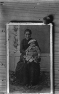 Reproducción de una fotografía con un retrato de plano entero de Tomasa, madre de María Iriarte, sentada con un niño en sus rodillas.