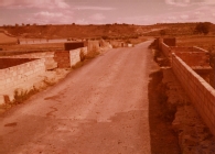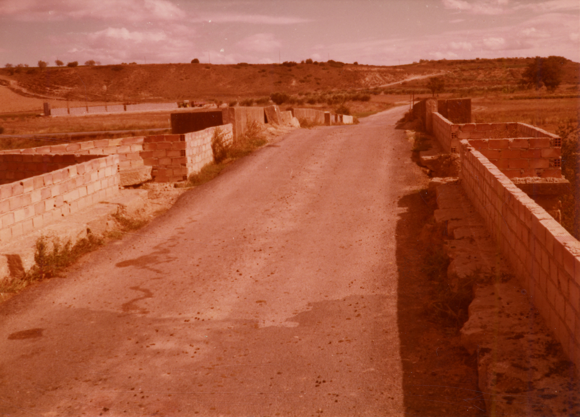 Vista general de la calzada del puente sobre el río Arga en Larraga, tomada desde la parte central hacia el sureste durante la ejecución de trabajos para ampliación de la calzada. En el centro, calzada asfaltada de la carretera Estella - Tafalla (actual NA-132) a su paso sobre el puente, protegida por pretiles de ladrillo y piedra. Al fondo, carretera sobre la margen izquierda.