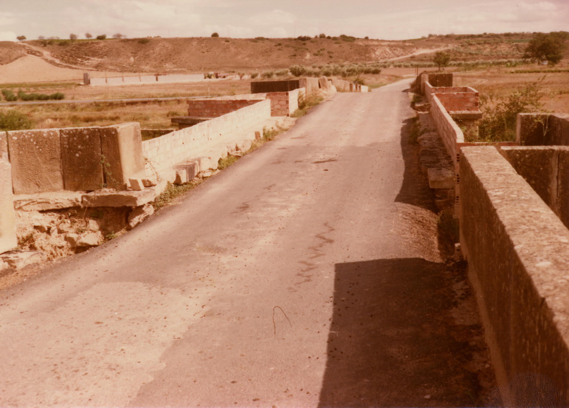 Vista general de la calzada del puente sobre el río Arga en Larraga, tomada desde la parte central hacia el sureste durante la ejecución de trabajos para ampliación de la calzada. En el centro, calzada asfaltada de la carretera Estella - Tafalla (actual NA-132) a su paso sobre el puente, protegida por pretiles de ladrillo y piedra. Al fondo, carretera sobre la margen izquierda.