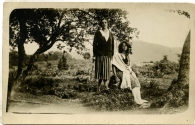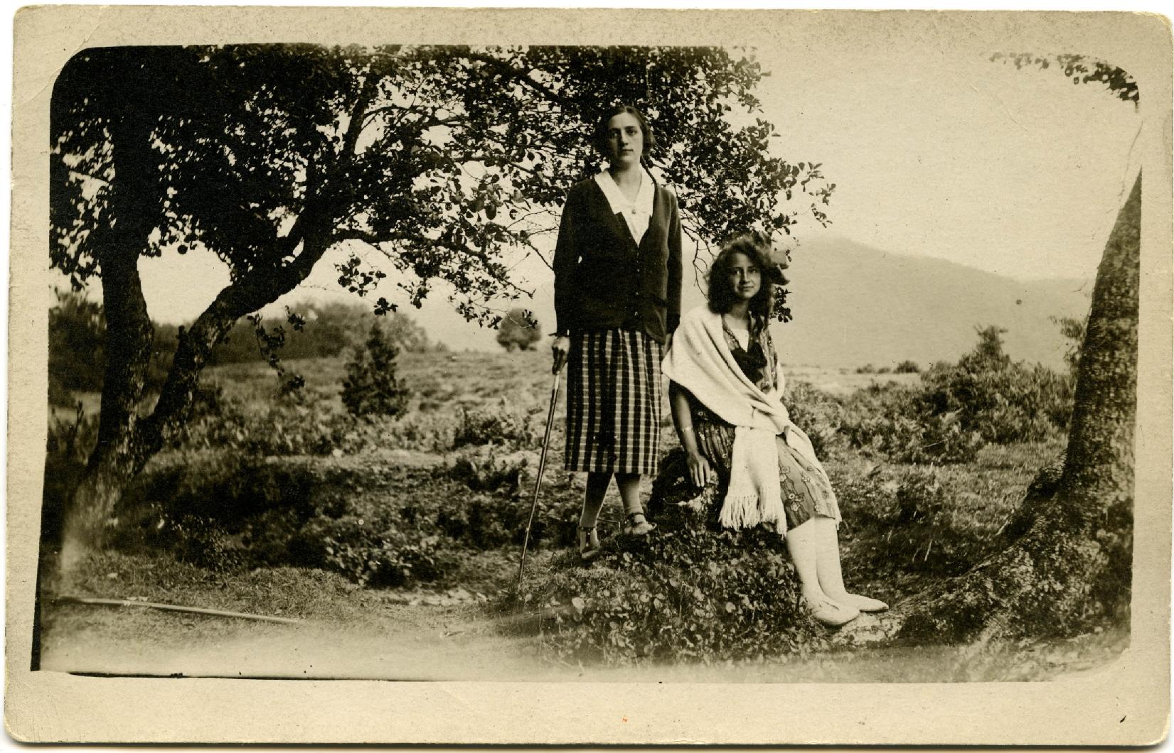 Retrato de Jenara Altadill Aldave, sentada, acompañada por otra muchacha, tomado en un paraje rural de Burguete durante una estancia de verano de la familia Altadill Aldave.